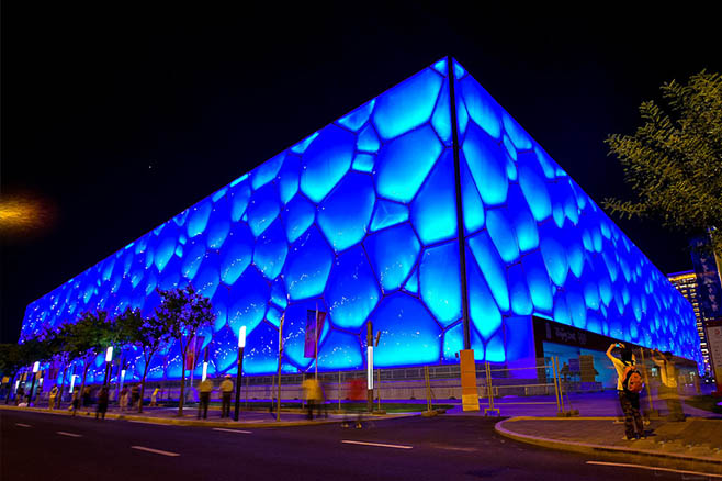 國(guó)家游泳中心又被稱為“水立方”(Water Cube)位于北京奧林匹克公園內(nèi),它的設(shè)計(jì)方案,是經(jīng)全球設(shè)計(jì)競(jìng)賽產(chǎn)生的“水的立方”(Water Cube )方案。其與國(guó)家體育場(chǎng)(俗稱鳥(niǎo)巢)分列于北京城市中軸線北端的兩側(cè),共同形成相對(duì)完整的北京歷史文化名城形象。國(guó)家游泳中心規(guī)劃建設(shè)用地62950平方米,總建筑面積65000-80000平方米,其中地下部分的建筑面積不少于15000平方米,長(zhǎng)寬高分別為 177m × 177m × 30m。來(lái)自101個(gè)國(guó)家和地區(qū)的35萬(wàn)多港澳臺(tái)同胞及海外僑胞共捐獻(xiàn)了9.4億人民幣。其中鄭裕彤、鄭家純父子及屬下企業(yè)曾捐贈(zèng)五千萬(wàn)元人民幣。